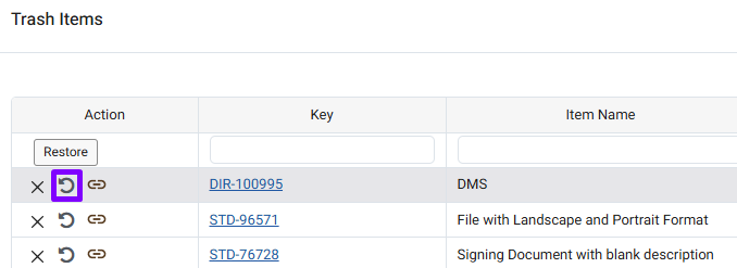 To restore an item, Click the ‘Restore‘ icon: