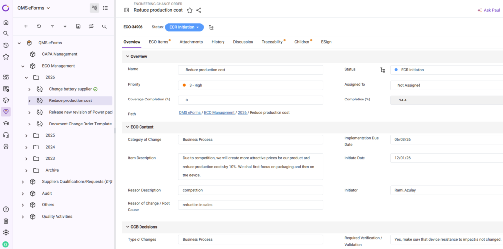 - Select “Engineering Change Order” work item