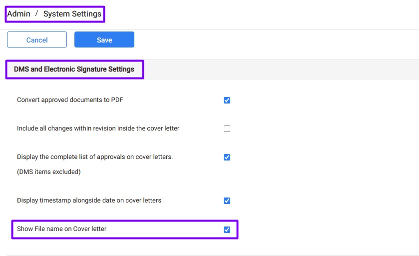 - Select/Unselect the checkbox for Show File name on Cover letter in the DMS and Electronic Signature Settings section as shown below.