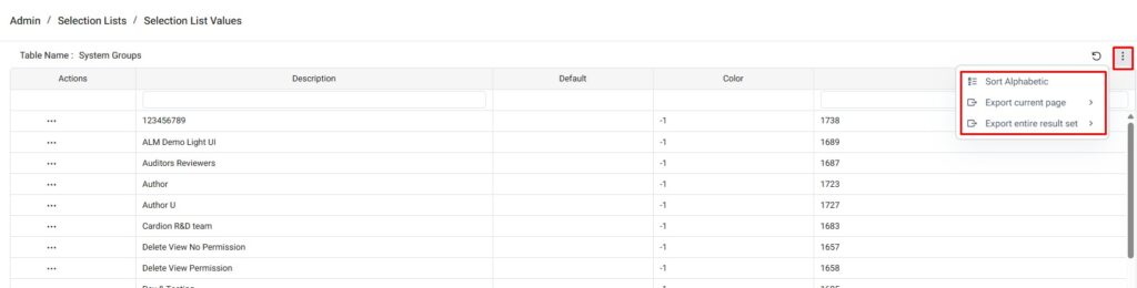 - Export Current Page: Enables the user to export values from the current page in CSV, Tab-separated, or HTML format.