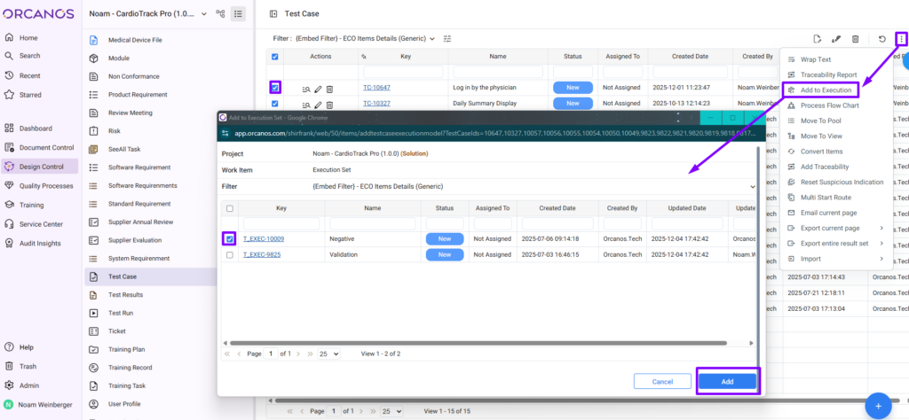 - Select the Execution Set in the grid where you want to add the Test Cases.